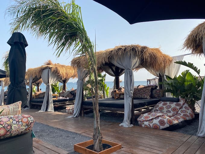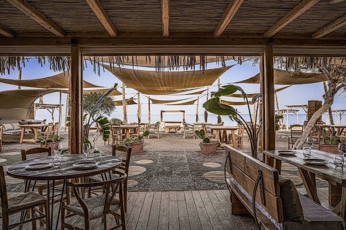 Seaside Santorini in Kamari is all about sophistication and comfort. The club offers sun loungers, exquisite Mediterranean cuisine, and a lively atmosphere. With its upscale setting, it's a fantastic place for those who want to combine relaxation with a touch of luxury.